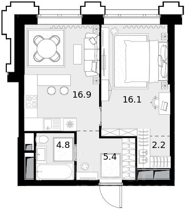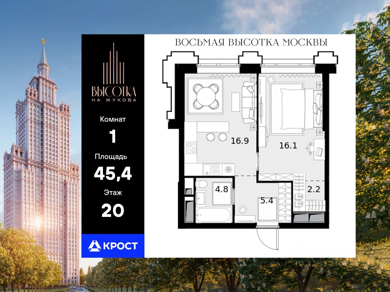 Однокомнатная квартира площадью 45,40 кв. м. на 20 этаже нового дома премиум-класса Высотка на Жукова