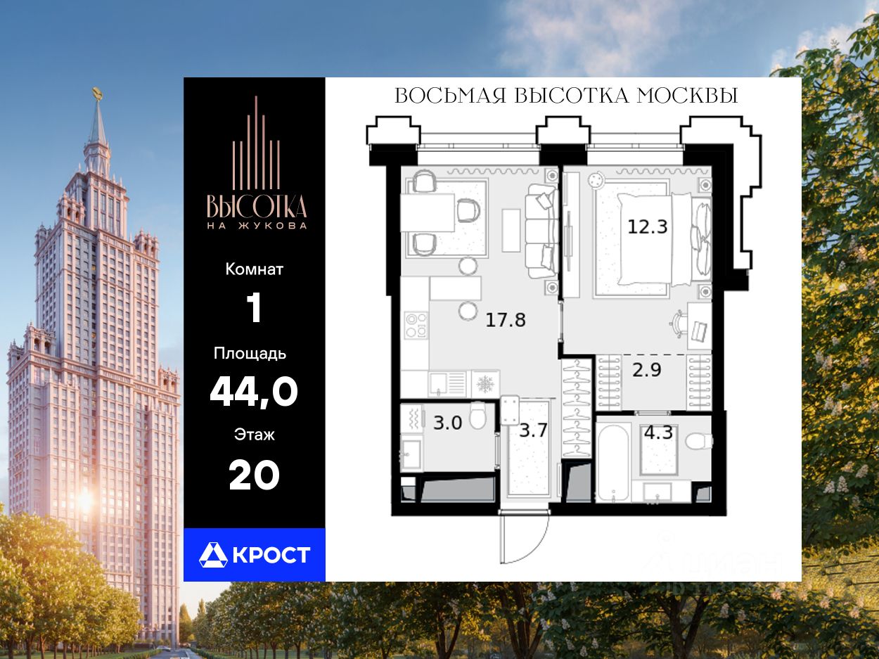 Однокомнатная квартира площадью 44,00 кв. м. на 20 этаже нового дома премиум-класса Высотка на Жукова