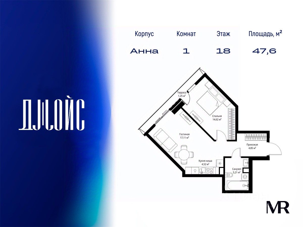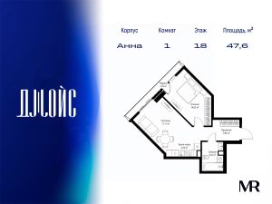 В продаже квартира площадью 47.56 м² без отделки на 18 этаже 55 этажного дома. Квартира расположена в корпусе Анна.