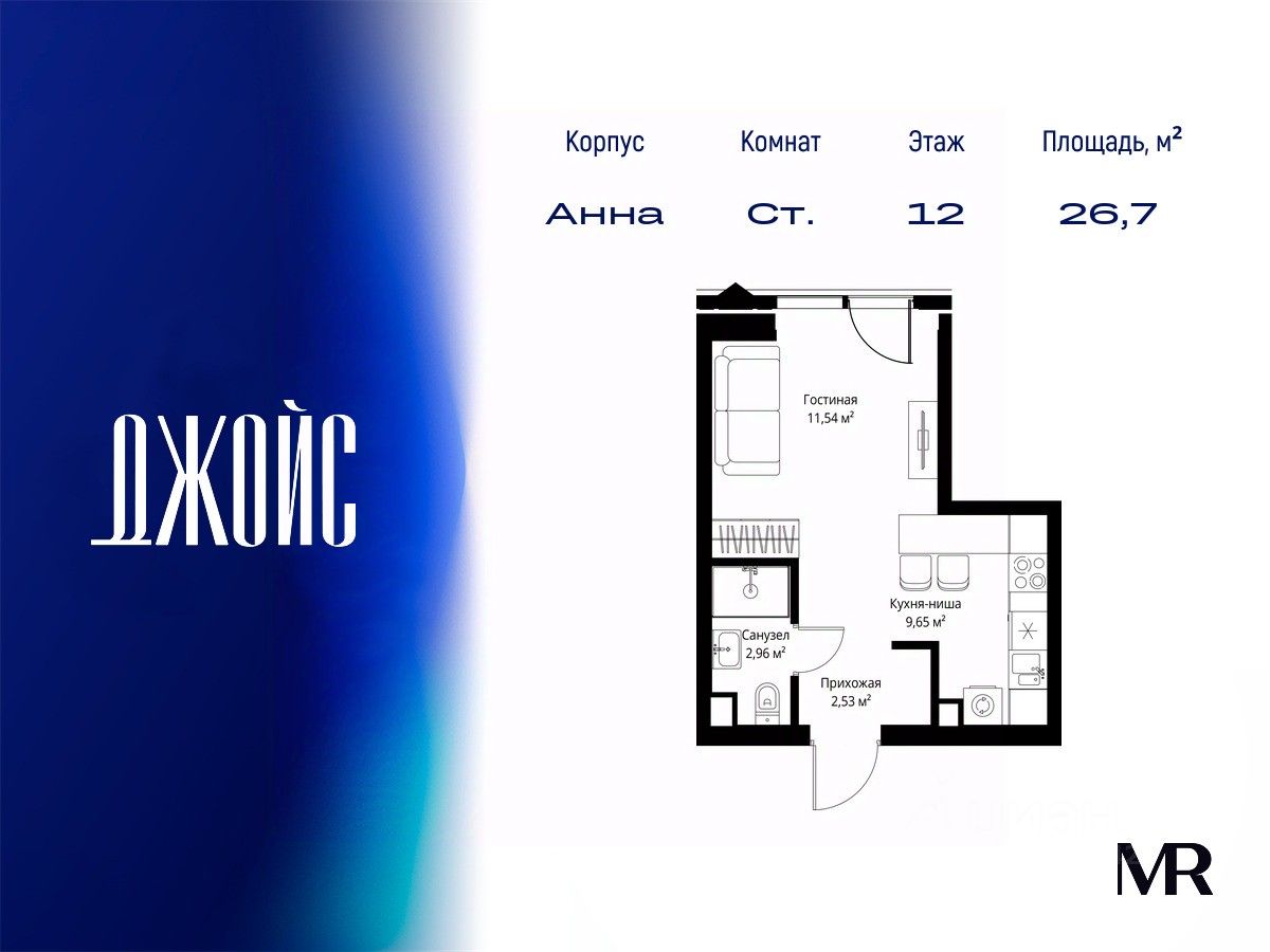 В продаже квартира площадью 26.68 м² с предчистовой отделкой на 12 этаже 55 этажного дома. Квартира расположена в корпусе Анна.