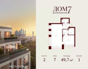 Продается 1-к квартира общей площадью 49.70 кв.м на 7 этаже в жилом квартале премиум-класса "Дом 7 Даниловский".