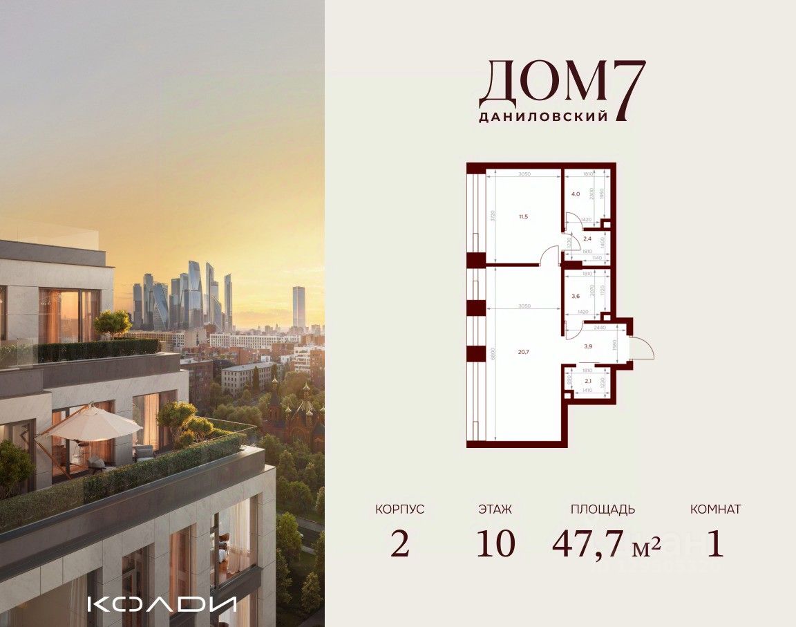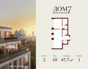 Продается 1-к квартира общей площадью 47.70 кв.м на 10 этаже в жилом квартале премиум-класса "Дом 7 Даниловский".