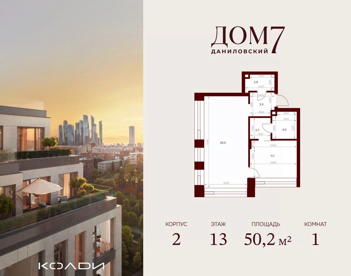 Продается 1-к квартира общей площадью 50.20 кв.м на 13 этаже в жилом квартале премиум-класса "Дом 7 Даниловский".