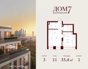 Продается 1-к квартира общей площадью 35.40 кв.м на 11 этаже в жилом квартале премиум-класса "Дом 7 Даниловский".