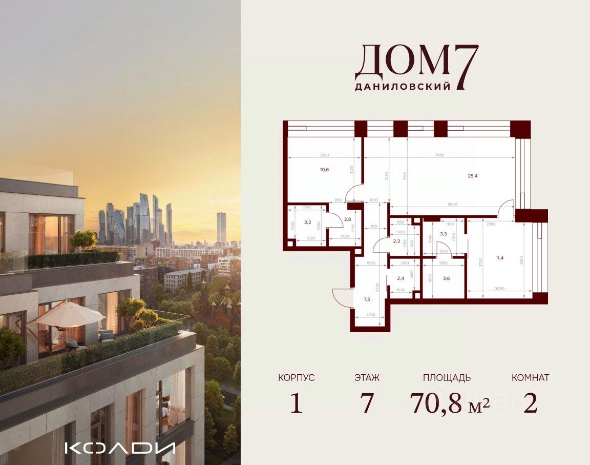 Продается 2-к квартира общей площадью 70.80 кв.м на 7 этаже в жилом квартале премиум-класса "Дом 7 Даниловский".