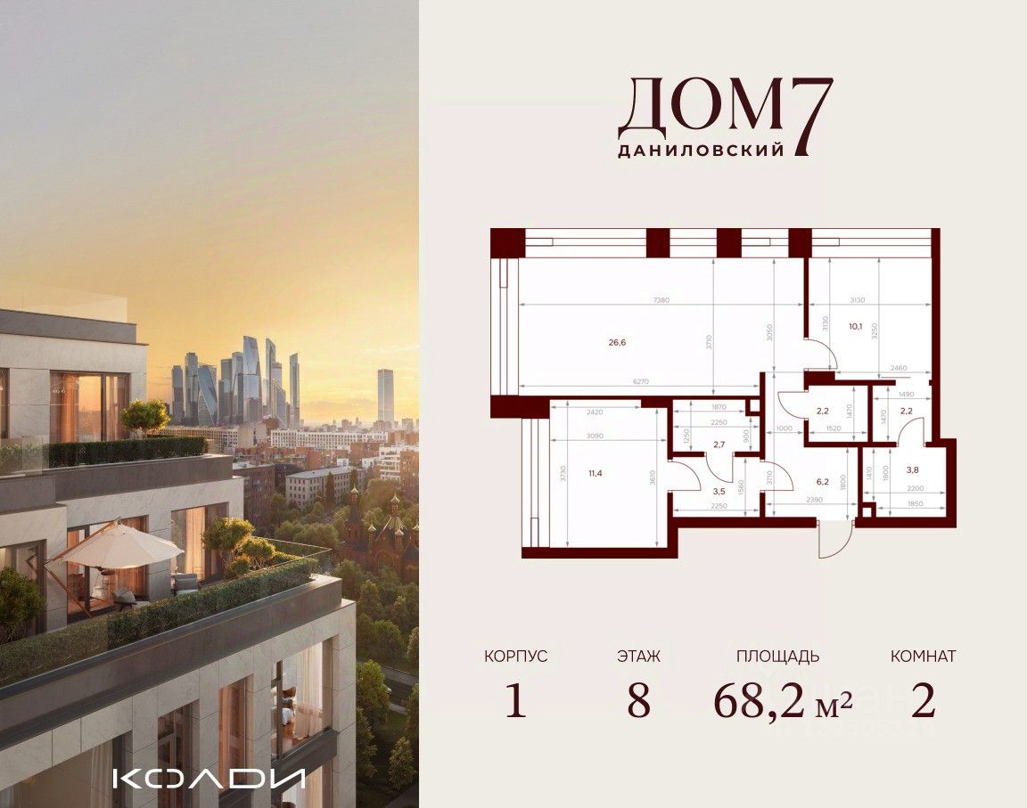 Продается 2-к квартира общей площадью 68.20 кв.м на 8 этаже в жилом квартале премиум-класса "Дом 7 Даниловский".