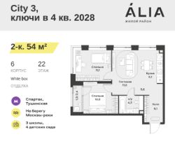 Продаётся 2-комнатная квартира 54 м². В жилом районе ALIA на 22-м этаже 28-этажного дома.