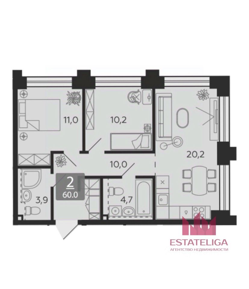 Кухня-гостиная, 2 спальни, 2 санузла, гардероб. Очень светлая квартира.