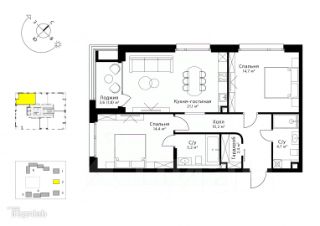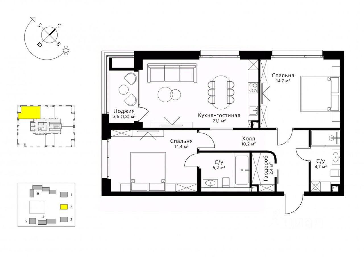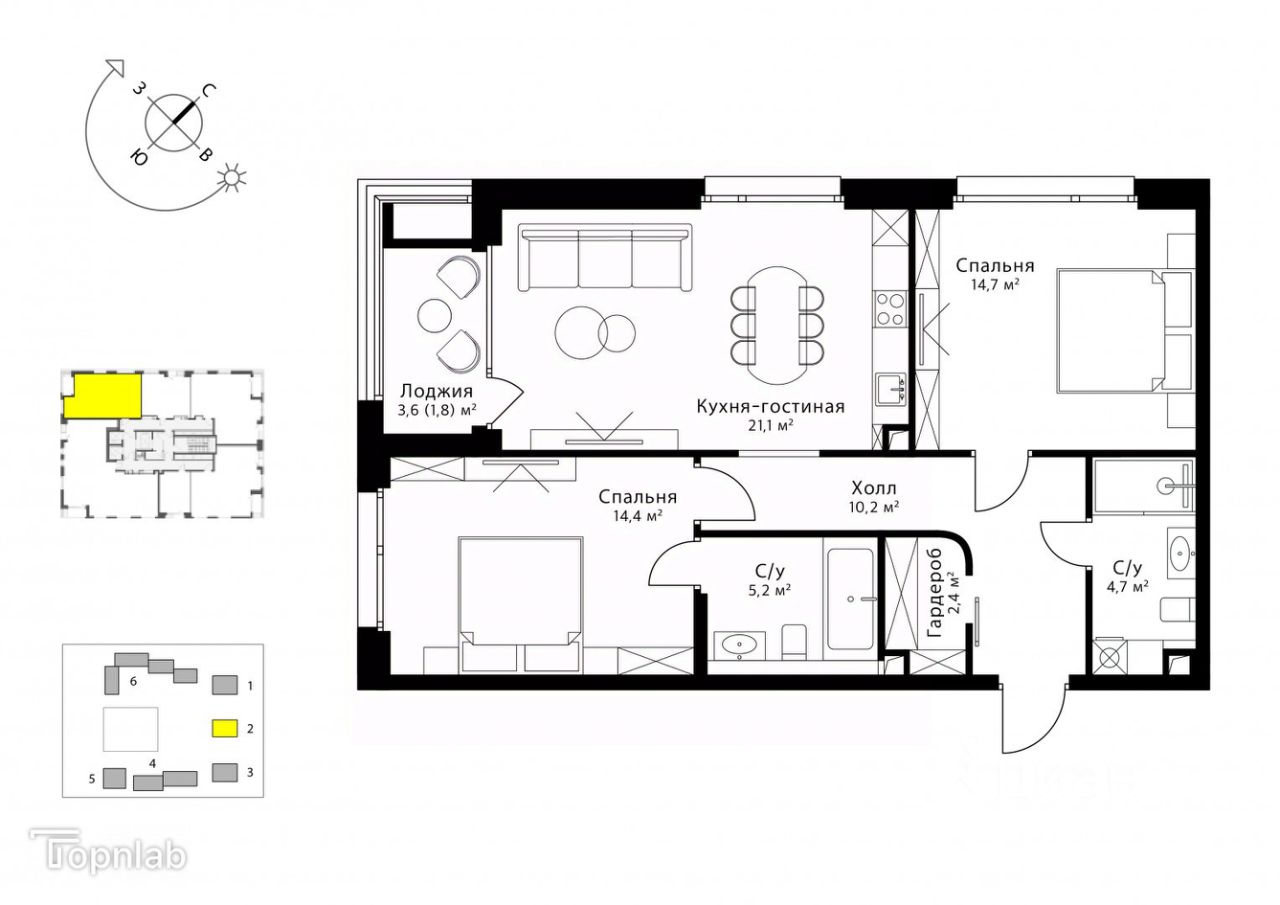 В квартире запланированы: одна мастер-спальня 14,4 м2 с большой ванной, кухня с гостиной зоной (всего 21,1 м2), вторая спальня 14,7 м2, санузел у входа и одна небольшая гардеробная (так же у входа).