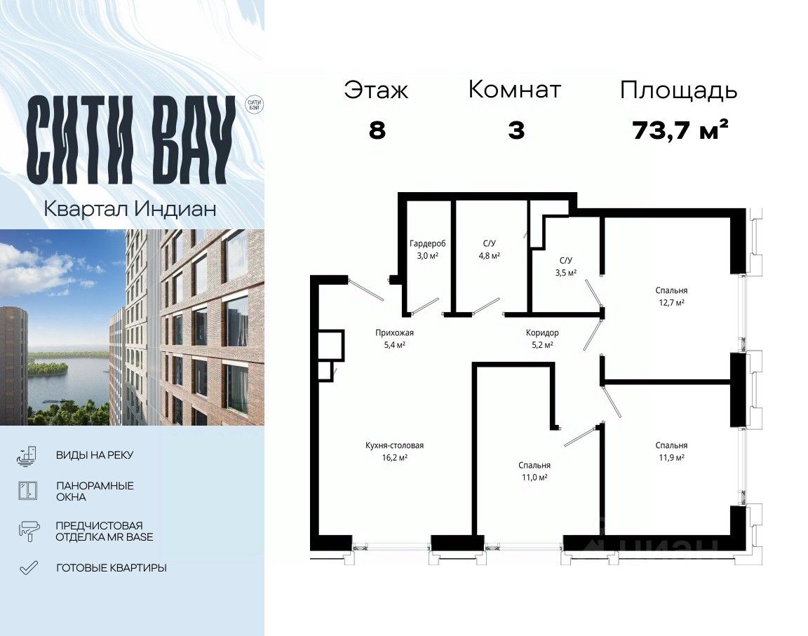 Продаётся 3-комнатная квартира общей площадью 73.70 м² с предчистовой отделкой в ЖК Сити Бэй на 8-м этаже 20 этажного дома.
