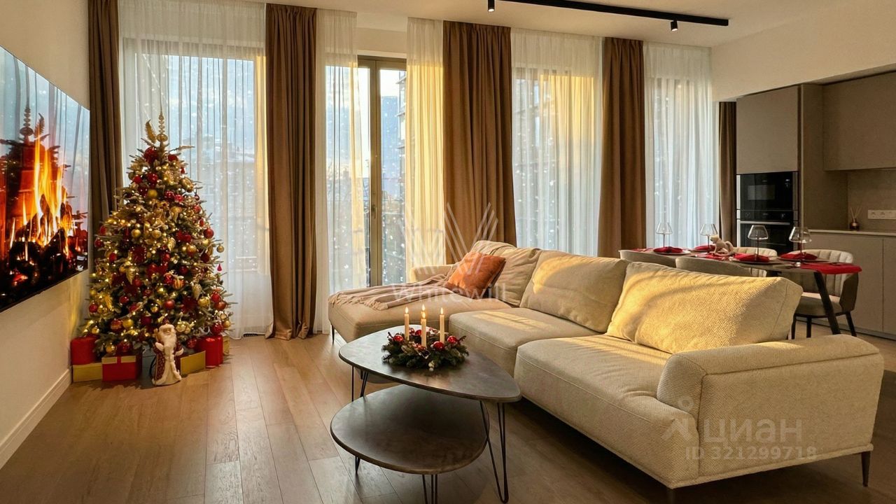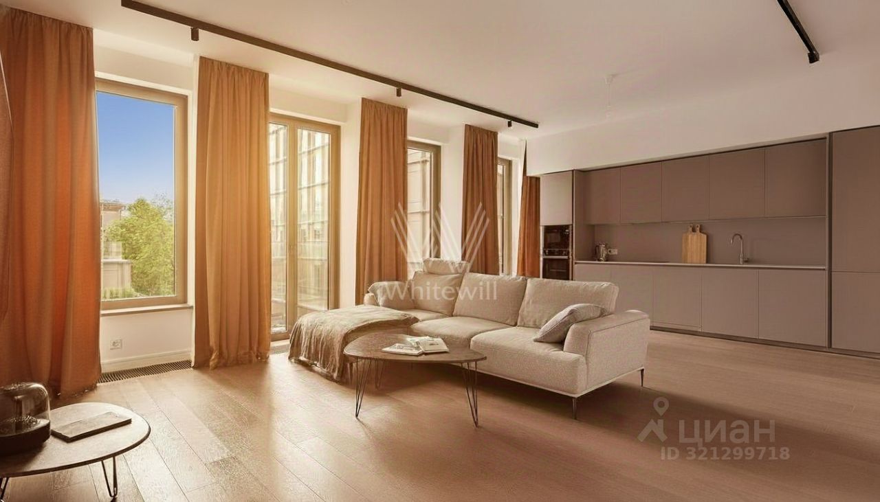 Квартира общей площадью 134 м² расположена на третьем этаже в корпусе 3К и предлагается к продаже с отделкой под ключ. Интерьер оформлен в лаконичных светлых тонах.