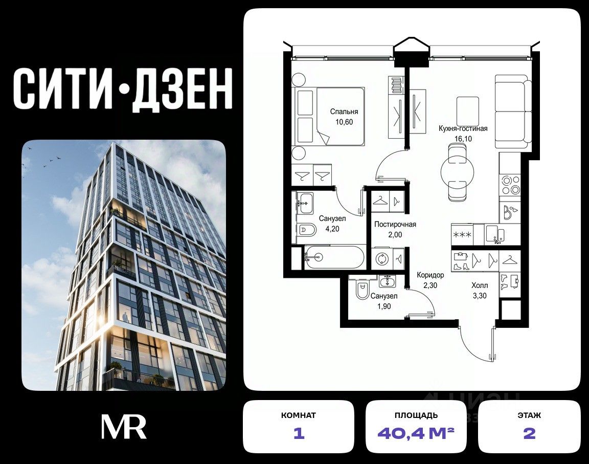 Продается 1-комнатная квартира от застройщика в жилом мультиквартале СИТИДЗЕН на 2-м этаже в корпусе #5. Общая площадь лота составляет 40.40 м²