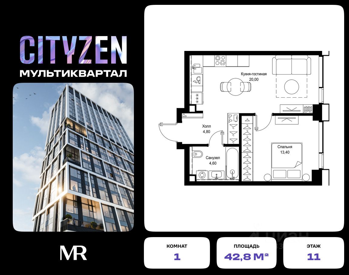 Продается 1-комнатная квартира от застройщика в жилом мультиквартале CITYZEN на 11-м этаже в корпусе #3 урбан-блока PARUS. Общая площадь лота составляет 42.80 м²