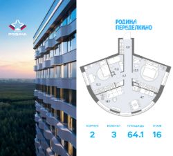 Продаётся 3-комнатная квартира площадью 64.1 м² на 16 этаже в Жилом Комплексе "Родина Переделкино".