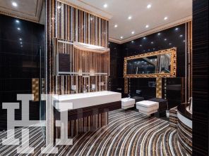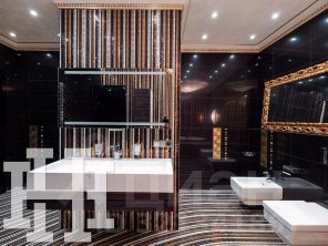 Планировка квартиры включает просторную гостиную, объединенную с кухней, 2 спальни, кабинет, санузел с джакузи и тропическим душем, гостевой санузел с душевой и большую прачечную.