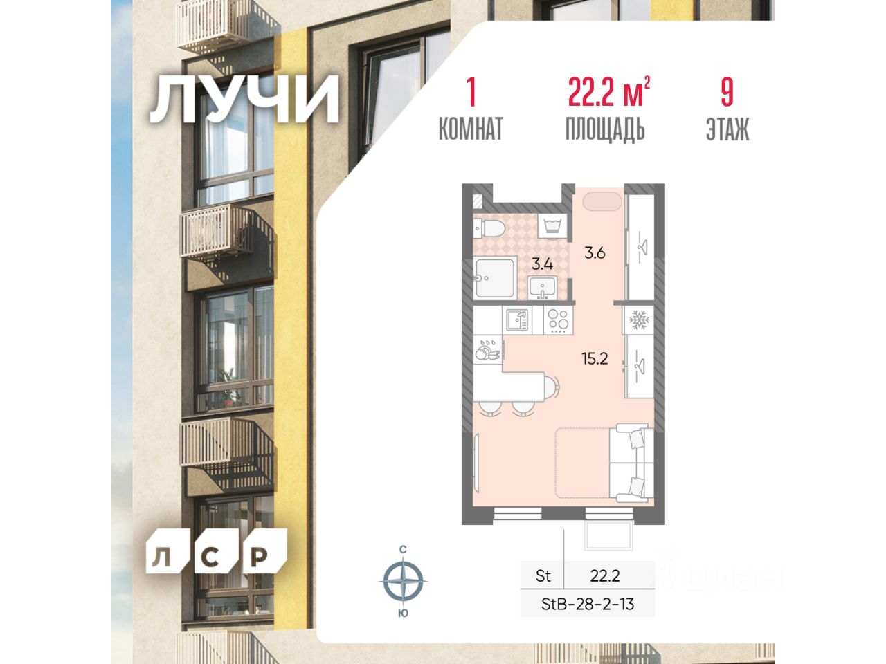 Продается квартира-студия общей площадью 22.2 кв. метров на 9 этаже жилого комплекса Лучи.