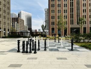 Концепция комплекса - двор без машин с ландшафтным дизайном; пруд с лаунж-зонами, шезлонгами и гамаками; спортивные площадки, амфитеатр, детские зоны.