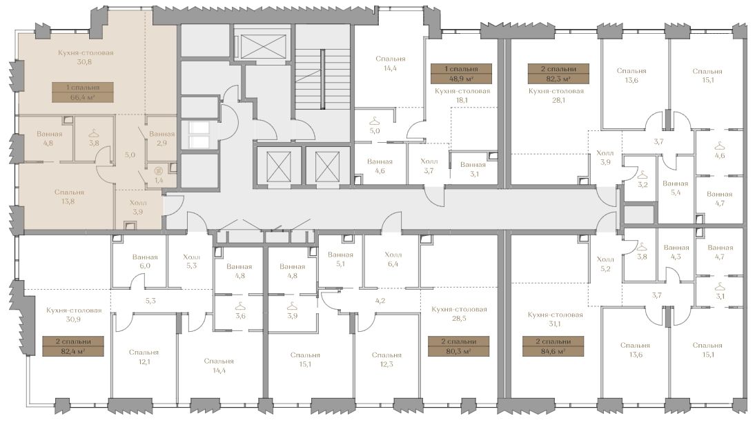 В клубном доме Mountain line проекта Luzhniki Collection в Хамовниках продаётся коллекционная премиальная квартира с 2 спальнями площадью 80,5 м2 c отделкой white-box на 4 этаже.