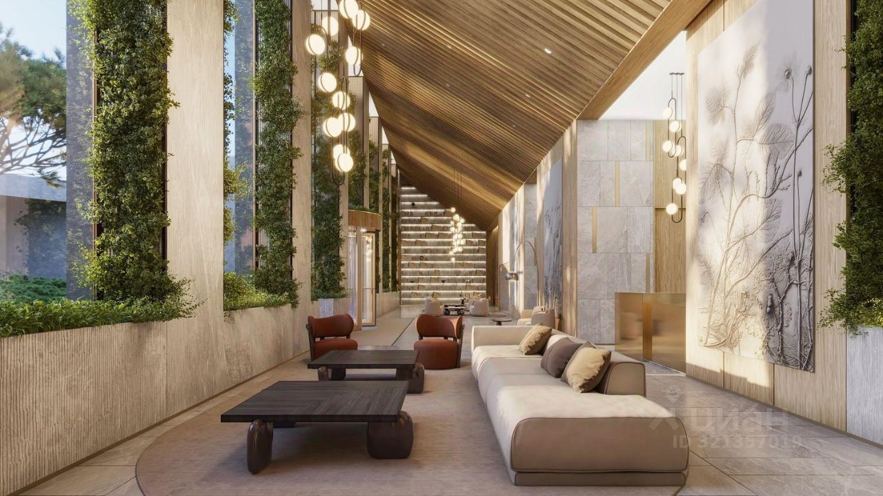 - Интерьерная концепция парадных Гарден-лобби обыгрывает тему единения с природой - активное использование натурального дерева, природного камня, вертикального озеленения