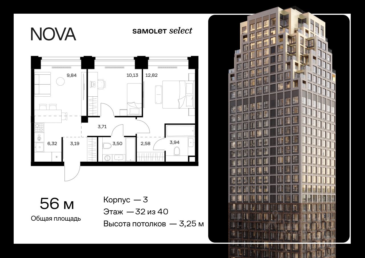 Предлагается 2-комнатная квартира премиум-класса 56,03 кв.м в корпусе 3 на 32 этаже, в ЖК "NOVA"