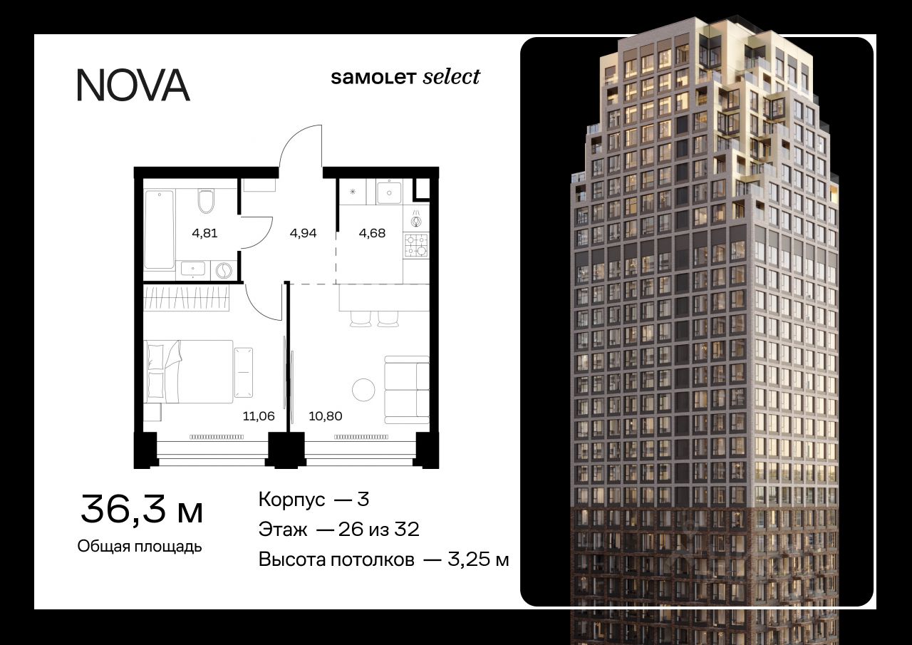 Предлагается 1-комнатная квартира премиум-класса 36,29 кв.м в корпусе 3 на 26 этаже, в ЖК "NOVA"