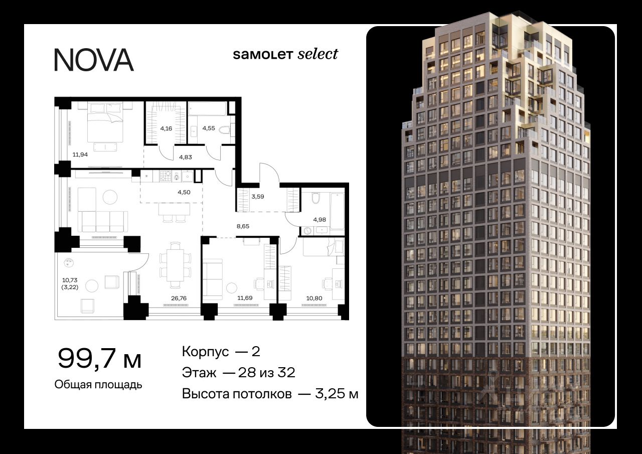 Предлагается 3-комнатная квартира премиум-класса 99,67 кв.м в корпусе 2 на 28 этаже, в ЖК "NOVA"