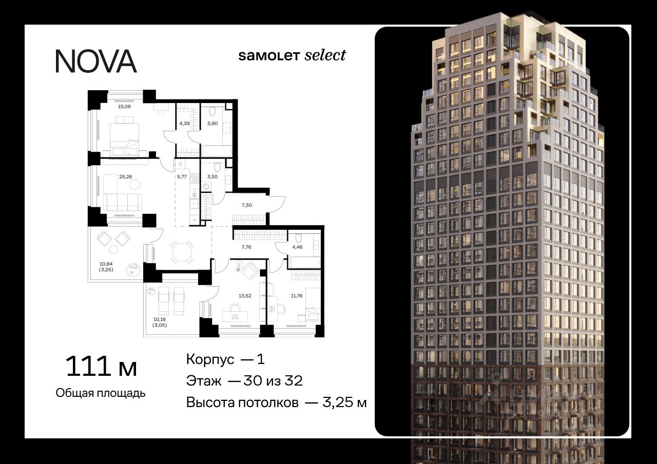 Предлагается 3-комнатная квартира премиум-класса 111,01 кв.м в корпусе 1 на 30 этаже, в ЖК "NOVA"