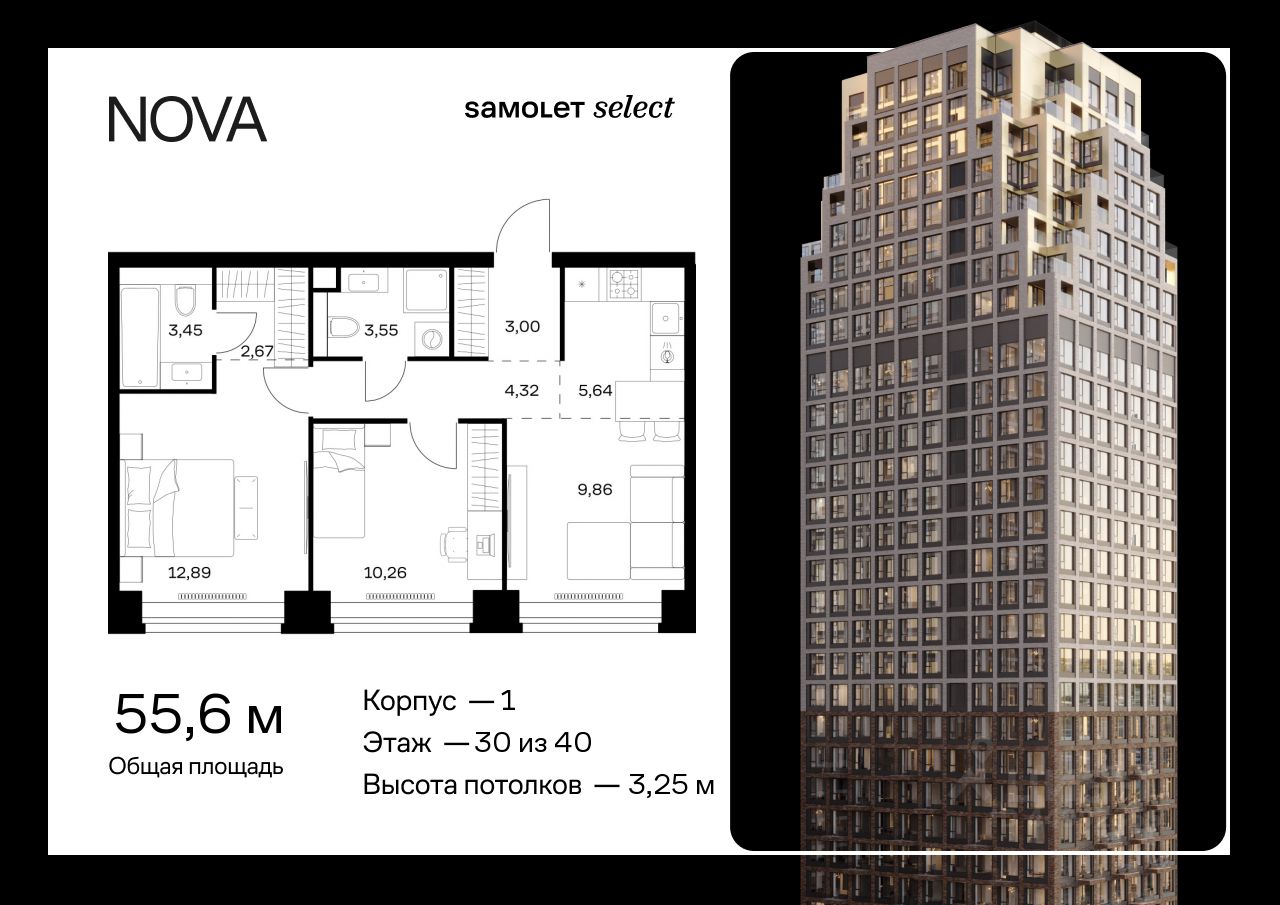 Предлагается 2-комнатная квартира премиум-класса 55,64 кв.м в корпусе 1 на 30 этаже, в ЖК "NOVA"