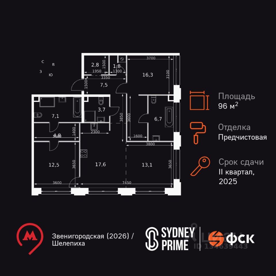 Продаётся 3-к квартира номер 2 общей площадью 96.4 кв.м. на 2-м этаже 9 этажного здания. Отделка Whitebox. Цена с учётом скидки.