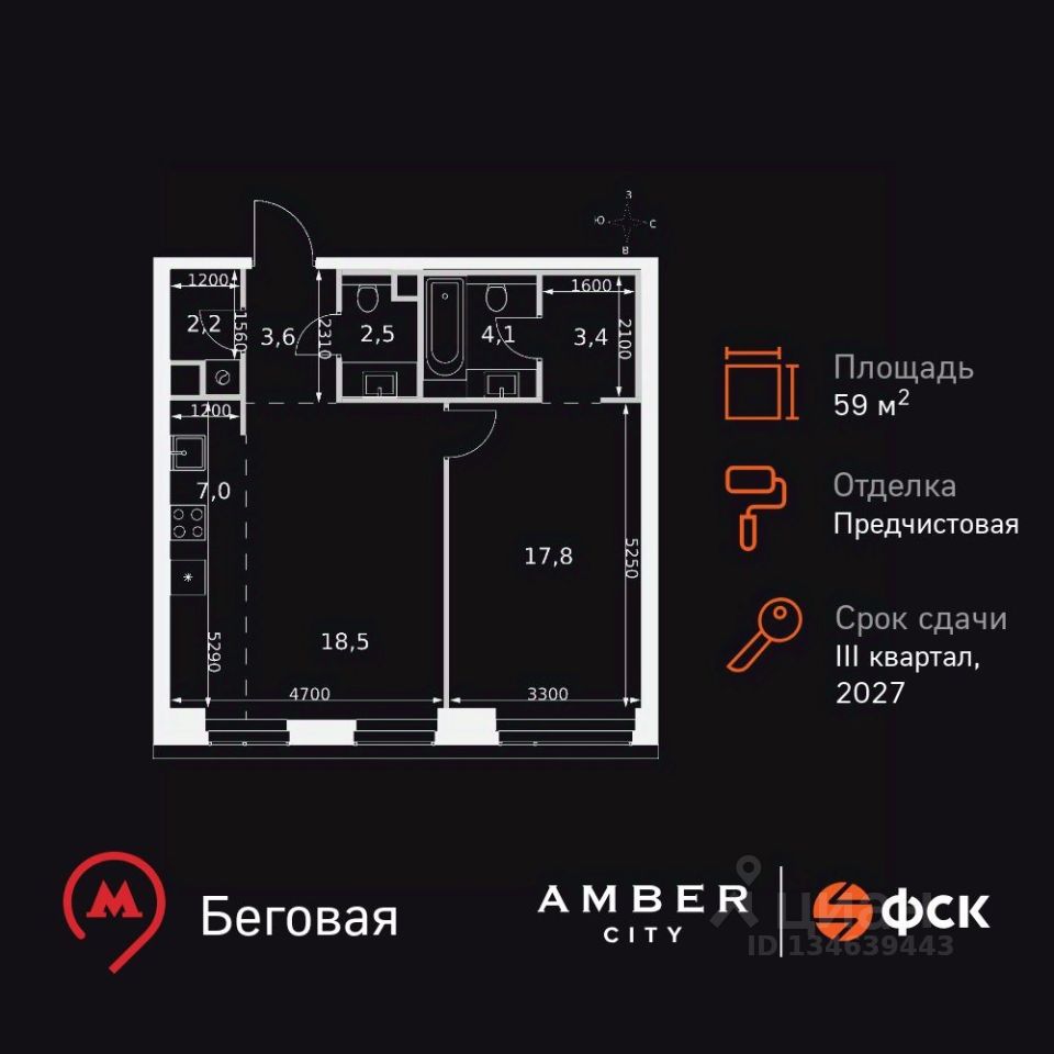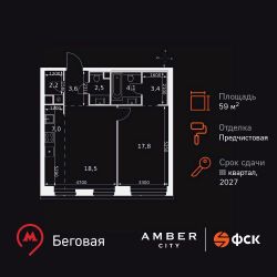 Продаётся 2-к квартира номер 335 общей площадью 59.1 кв.м. на 24-м этаже 46 этажного здания. Отделка Whitebox. Цена с учётом скидки.