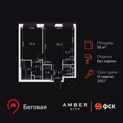 Продаётся 2-к квартира номер 538 общей площадью 58.1 кв.м. на 38-м этаже 46 этажного здания. Без отделки. Цена с учётом скидки.