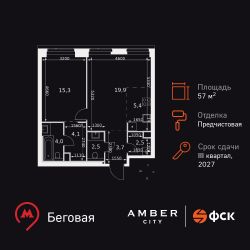 Продаётся 2-к квартира номер 358 общей площадью 57.4 кв.м. на 25-м этаже 46 этажного здания. Отделка Whitebox. Цена с учётом скидки.