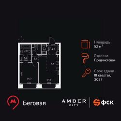 Продаётся 2-к квартира номер 4 общей площадью 52.4 кв.м. на 2-м этаже 46 этажного здания. Отделка Whitebox. Цена с учётом скидки.