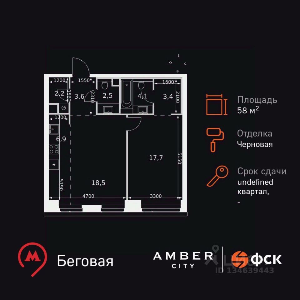 Продаётся 2-к квартира номер 5 общей площадью 58.9 кв.м. на 2-м этаже 46 этажного дома. Отделка Whitebox. Цена с учётом скидки!