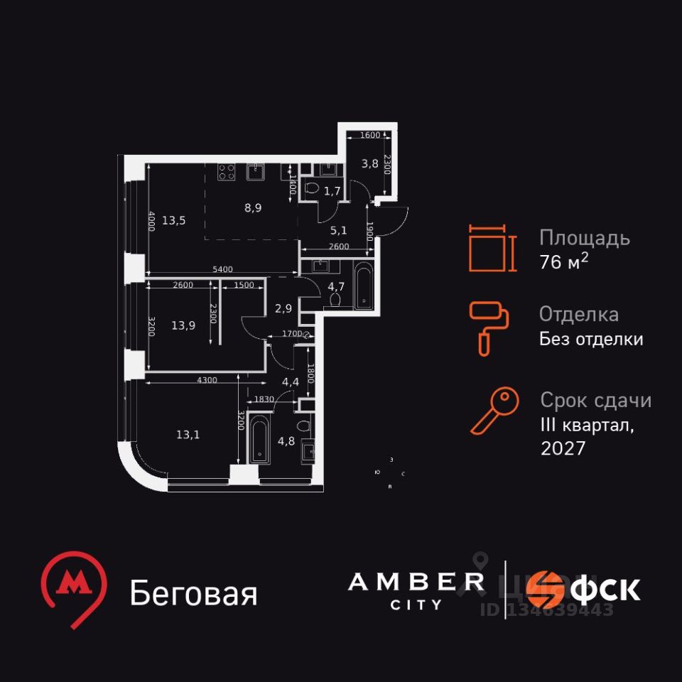 Продаётся 3-к квартира номер 68 общей площадью 76.8 кв.м. на 6-м этаже 46 этажного здания. Без отделки. Цена с учётом скидки.