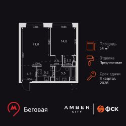 Продаётся 2-к квартира номер 893 общей площадью 54.8 кв.м. на 21-м этаже 57 этажного здания. Отделка Whitebox. Цена с учётом скидки.