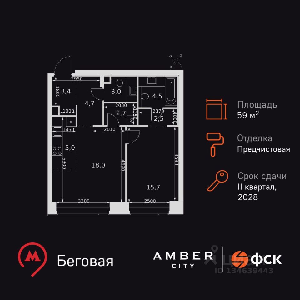 Продаётся 2-к квартира номер 705 общей площадью 59.5 кв.м. на 7-м этаже 57 этажного здания. Отделка Whitebox. Цена с учётом скидки.