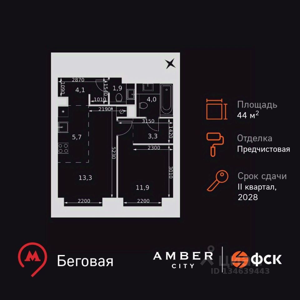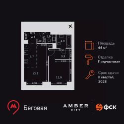 Продаётся 2-к квартира номер 654 общей площадью 44.2 кв.м. на 3-м этаже 57 этажного здания. Отделка Whitebox. Цена с учётом скидки.