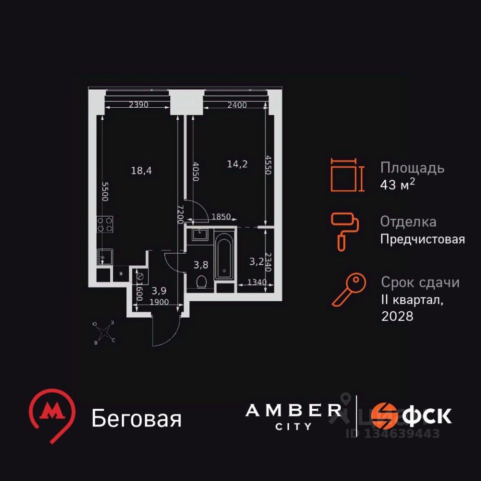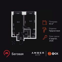 Продаётся 1-к квартира номер 658 общей площадью 43.5 кв.м. на 3-м этаже 57 этажного здания. Отделка Whitebox. Цена с учётом скидки.