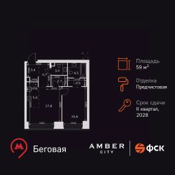 Продаётся 2-к квартира номер 666 общей площадью 59.2 кв.м. на 4-м этаже 57 этажного здания. Отделка Whitebox. Цена с учётом скидки.