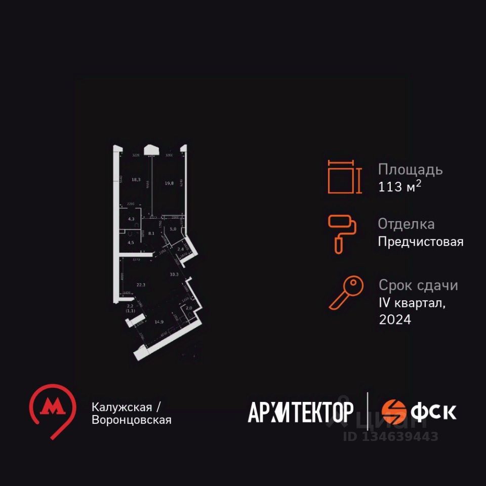Продаётся 3-к квартира номер 1097 общей площадью 113 кв.м. на 11-м этаже 47 этажного здания. Отделка Whitebox. Цена с учётом скидки.