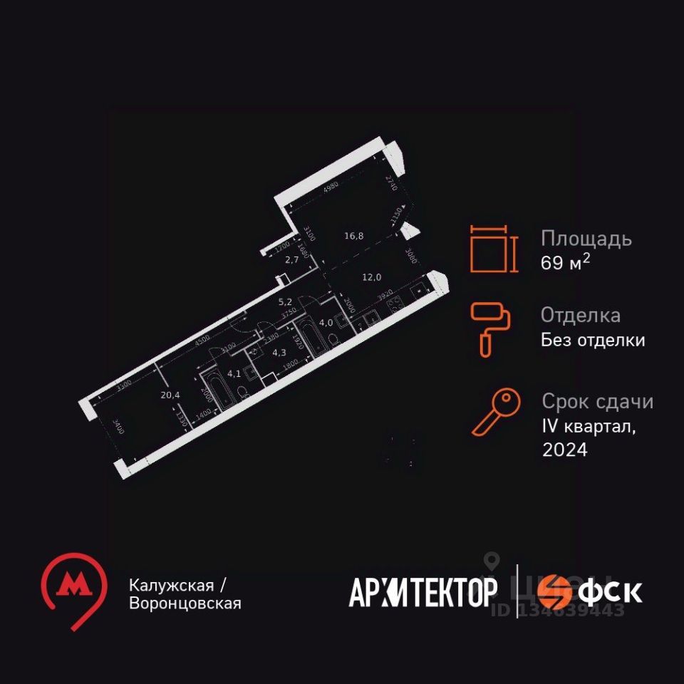 Продаётся 2-к квартира номер 1265 общей площадью 69.5 кв.м. на 46-м этаже 47 этажного здания. Без отделки. Цена с учётом скидки.