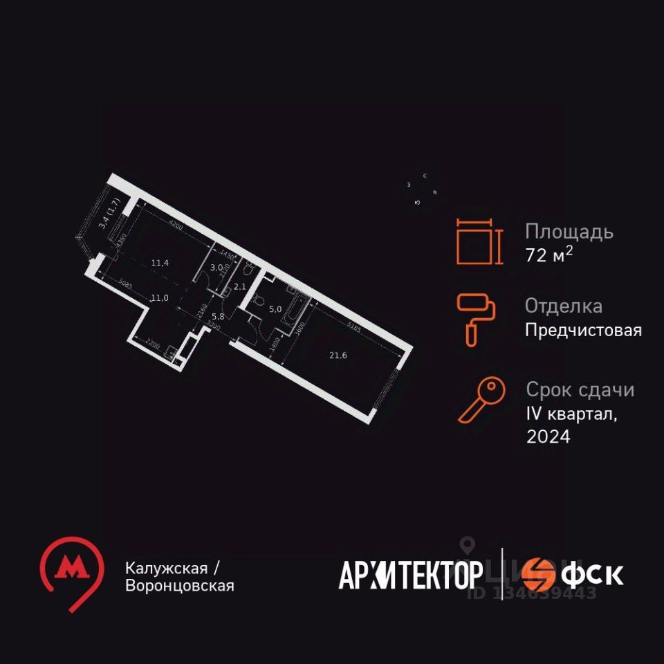 Продаётся 2-к квартира номер 336 общей площадью 72 кв.м. на 26-м этаже 46 этажного здания. Отделка Whitebox. Цена с учётом скидки.