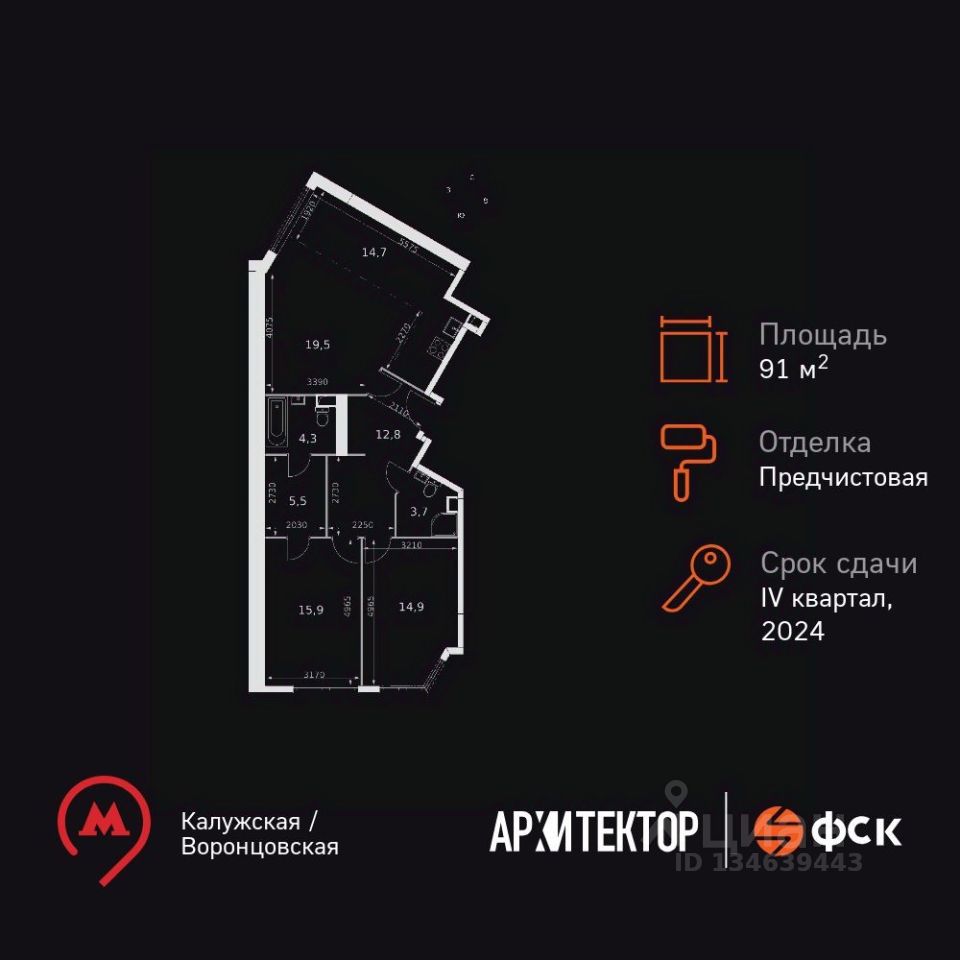Продаётся 3-к квартира номер 359 общей площадью 91.3 кв.м. на 30-м этаже 46 этажного здания. Отделка Whitebox. Цена с учётом скидки.