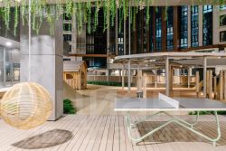В ЖК продуманная, богатая инфраструктура из трех зон. В основной входной группе сконцентрированы все блага современного мегаполиса: супермаркет, ресторан, фитнес-клуб, аптеки, салоны красоты и кофейня. Под шумные детские игры отв