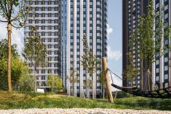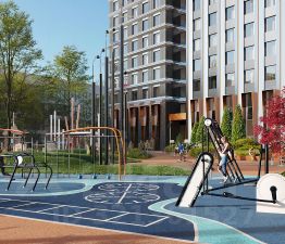 Внешняя территория комплекса условно делится на три зоны. Основная входная группа представляет собой открытую зону коммерческих помещений (кофейня, аптека, салон красоты). В закрытой зоне внутреннего двора время течет как в замедленной съемке. Скамейки, шезлонги, пуфы, садовые качели приглашают расслабленно провести часок-другой наедине с собой или в небольшой компании. В восточной части территории расположены игровые площадки для детей разных возрастов, а также спортивные площадки. Авторам проекта архитектурному бюро ICube удалось воссоздать атмосферу детских фильмов!