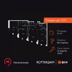Продаётся 3-к квартира номер 13 общей площадью 77.9 кв.м. на 4-м этаже 20 этажного здания. Без отделки. Цена с учётом скидки.