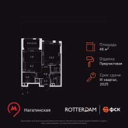 Продаётся 2-к квартира номер 79 общей площадью 46.2 кв.м. на 12-м этаже 29 этажного здания. Отделка Whitebox. Цена с учётом скидки.