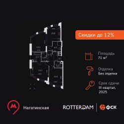 Продаётся 3-к квартира номер 108 общей площадью 71.7 кв.м. на 2-м этаже 20 этажного здания. Без отделки. Цена с учётом скидки.