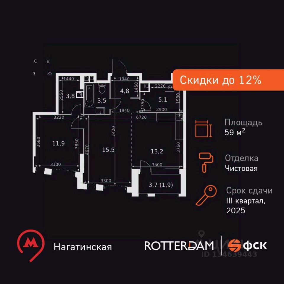 Продаётся 2-к квартира номер 439 общей площадью 59.7 кв.м. на 8-м этаже 29 этажного здания. Чистовая отделка. Цена с учётом скидки.